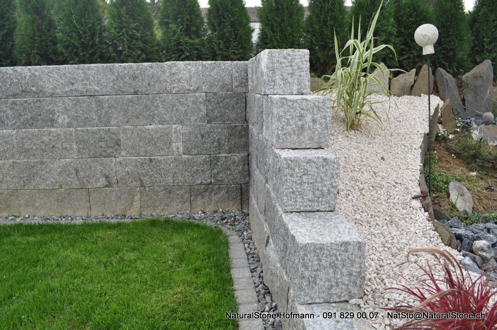 Tessiner Mauerstein aus hellem Gneis. Typ Lego für einfaches Versetzen. Die